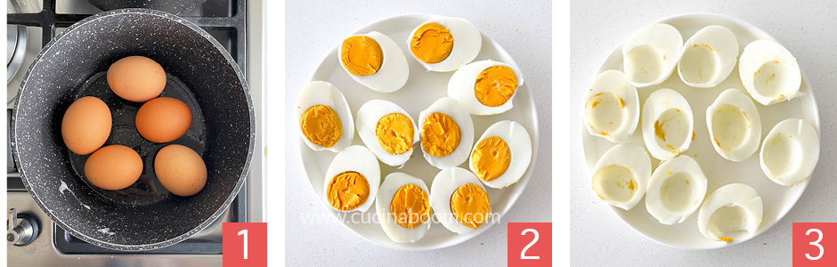 Отвариваем яйца в крутую. Им нужно около 10 минут, от начала кипения, чтобы достаточно хорошо провариться. затем их нужно тут же смыть под проточной холодной водой. Яйца готовы (фото 1) их можно очищать и нарезать пополам (фото 2). Используйте самый острый нож и промывайте его после каждого яйца, чтобы кусочки желтка от предыдущего яйца, которые прилипают к лезвию не испачкали следующее .