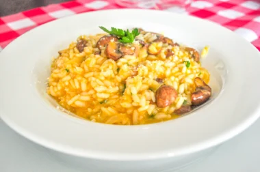 Этот итальянский рецепт ризотто не только содержит грибы в своем составе, но заправлен еще и кремом из тыквы, которая органично сочетается со вкусом шампиньонов. Распознать тыкву в готовом блюде довольно сложно, а выходит ризотто откровенно ВКУСНО!